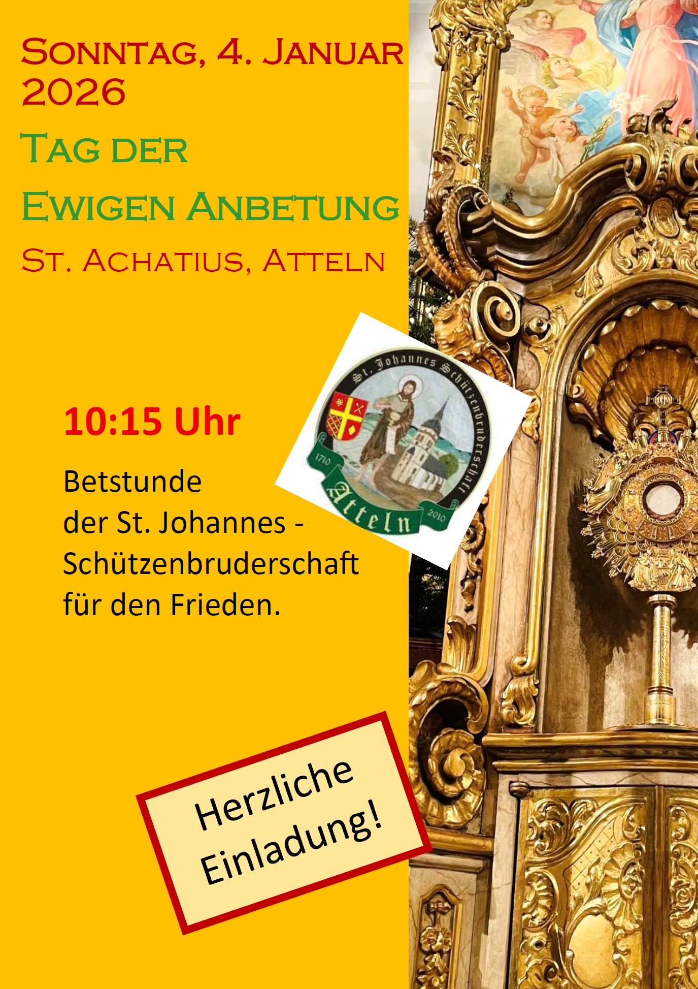 Am Sonntag, den 04.01.2026, um 10:15 Uhr findet die Betstunde der St. Johannes Schützenbruderschaft zum Tag der ewigen Anbetung statt.